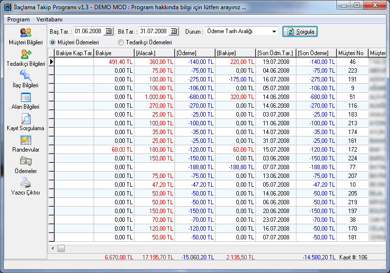 - Randevu Sorgulama, Ödeme Sorgulama ve Kayıt Arama ekranlarında çift tıklama ile, ilgili Müşteri, Uygulama veya Ödeme bilgileri ekranına gitme işlevinde, çift tıklama öncesinde veritabanı "düzenleme" veya "yeni kayıt" durumunda olduğunda Müşteri Bilgileri ekranında meydana gelen buton işlevi takılma problemi giderildi.
